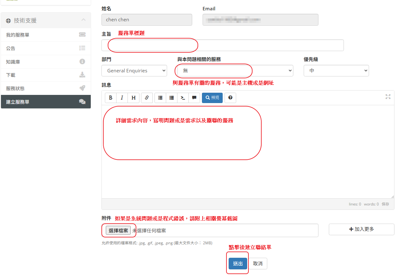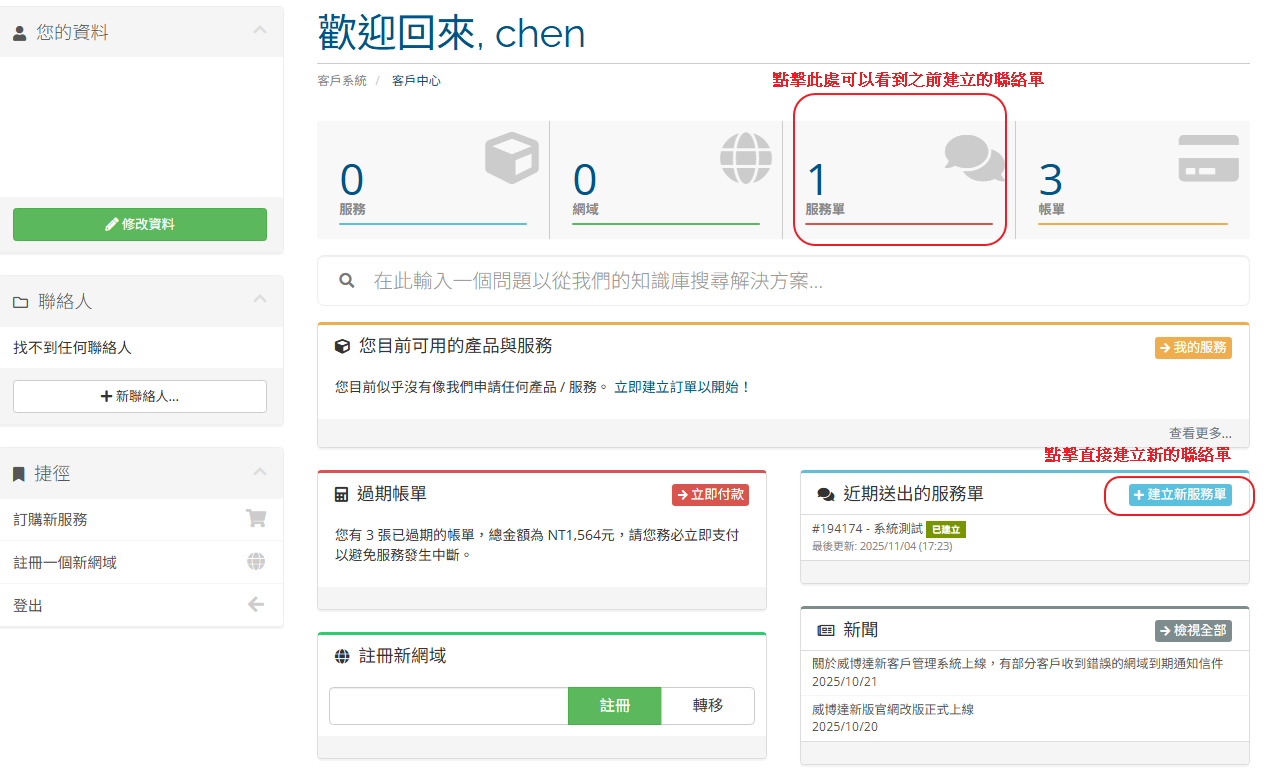 當有額外的需求需要請求管理員進行操作時由於牽涉到個資的問題需要驗證身分可以透過 WHMCS 直接建立服務單以下是建立聯絡單的操作流程
