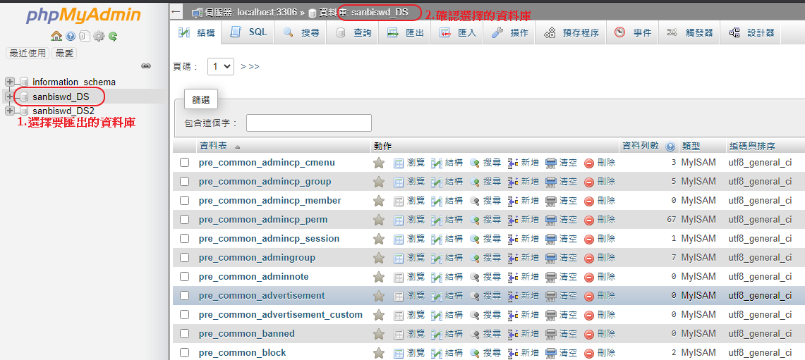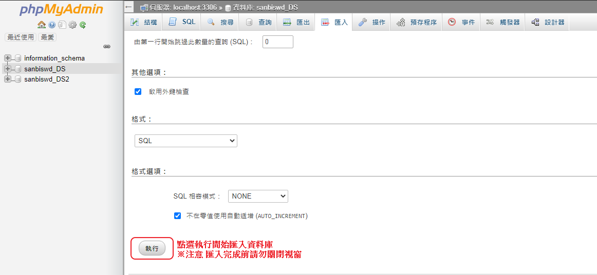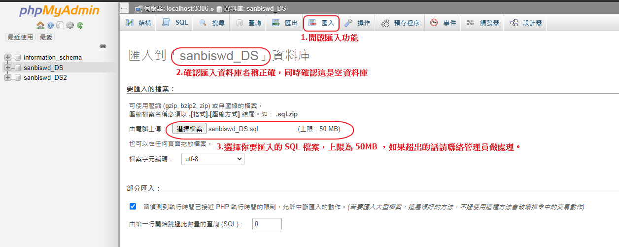 前兩步與匯出資料庫相同選擇需要匯入的資料庫※注意1.匯入資料庫請再三確認正確避免造成現有資料庫損毀※注意2.phpMyadmin 匯入檔案大小上限為 50MB ,如果超出大小請聯繫管理員做處理