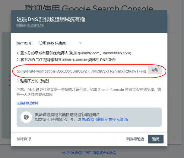 STEP.1 首先這是常見的 google 驗證網域所有權的要求畫面