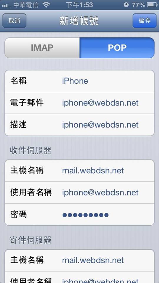 Step6: 選擇POP協定,收件伺服器及寄件伺服器的主機名稱均設定”mail.網域”