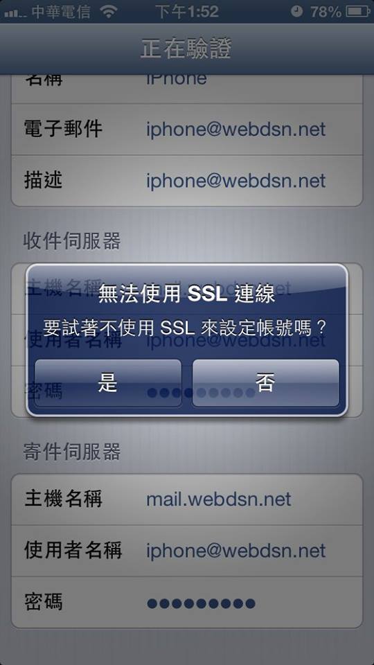 Step8:驗證後會出現”無法使用SSL連線”,選擇”是”不使用SSL