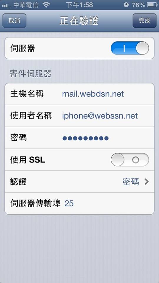 Step14:進入後將SSL關閉,認證改”密碼”,並將傳輸阜改為25
