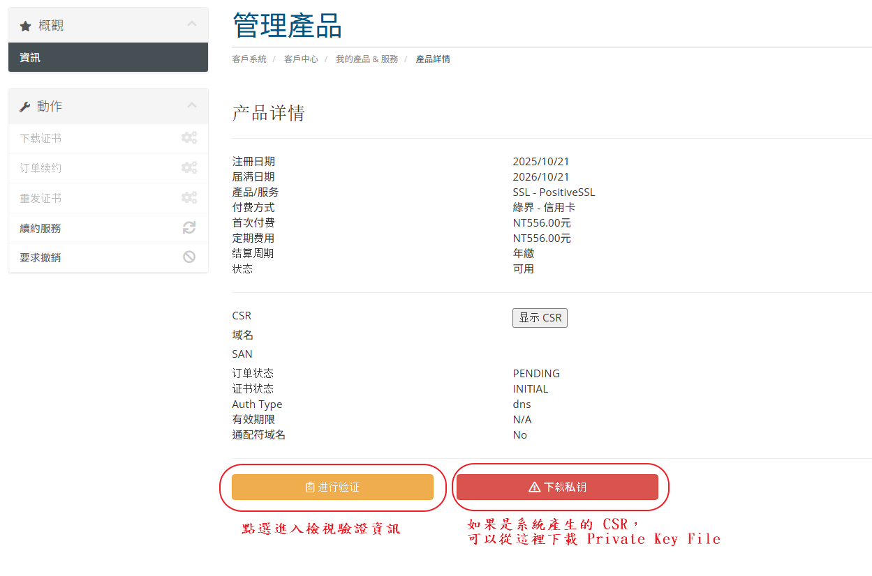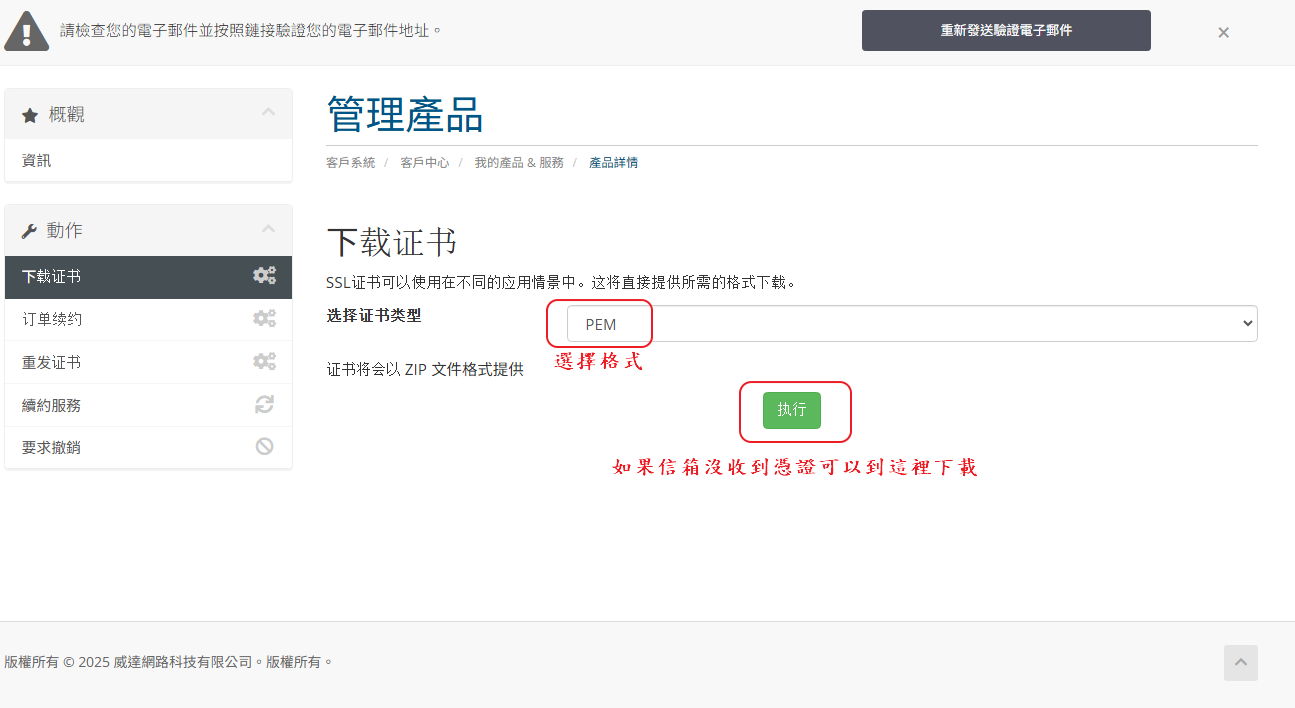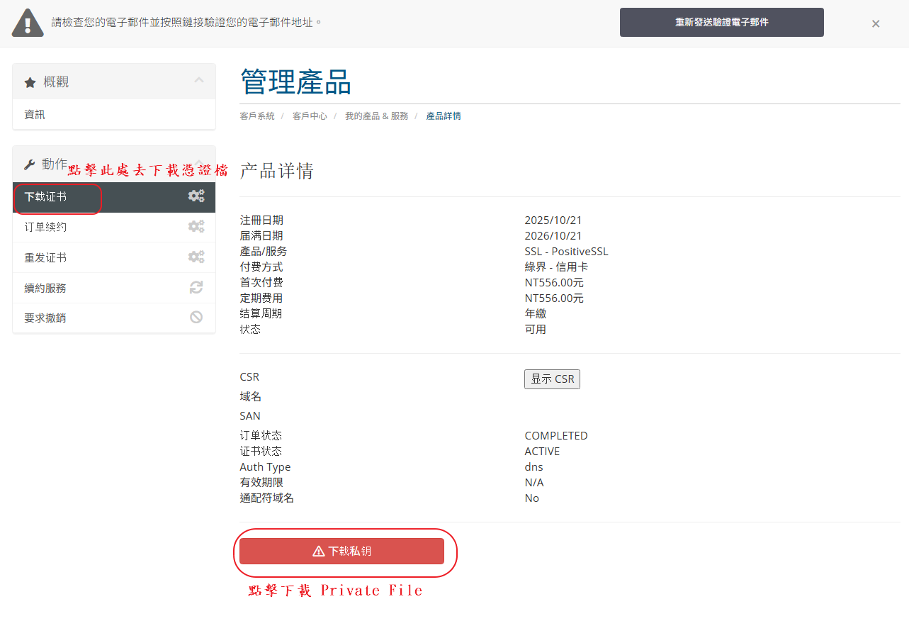 STEP.10 憑證核發下來後除了會寄到 STEP.7-1 填的聯絡信箱以外,也可以從 WHMCS 直接下載憑證檔案。