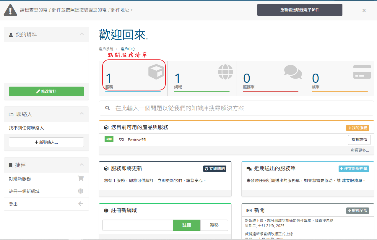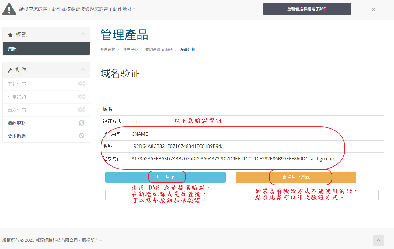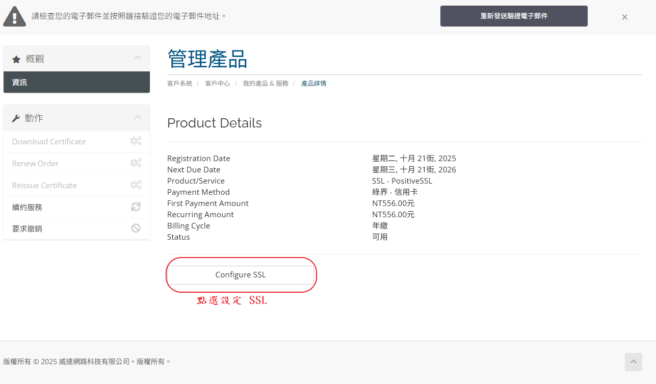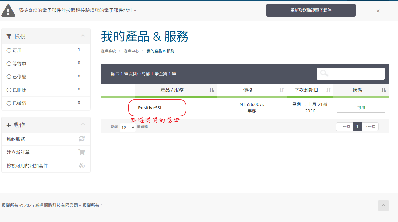 STEP.10 憑證核發下來後除了會寄到 STEP.7-1 填的聯絡信箱以外,也可以從 WHMCS 直接下載憑證檔案。