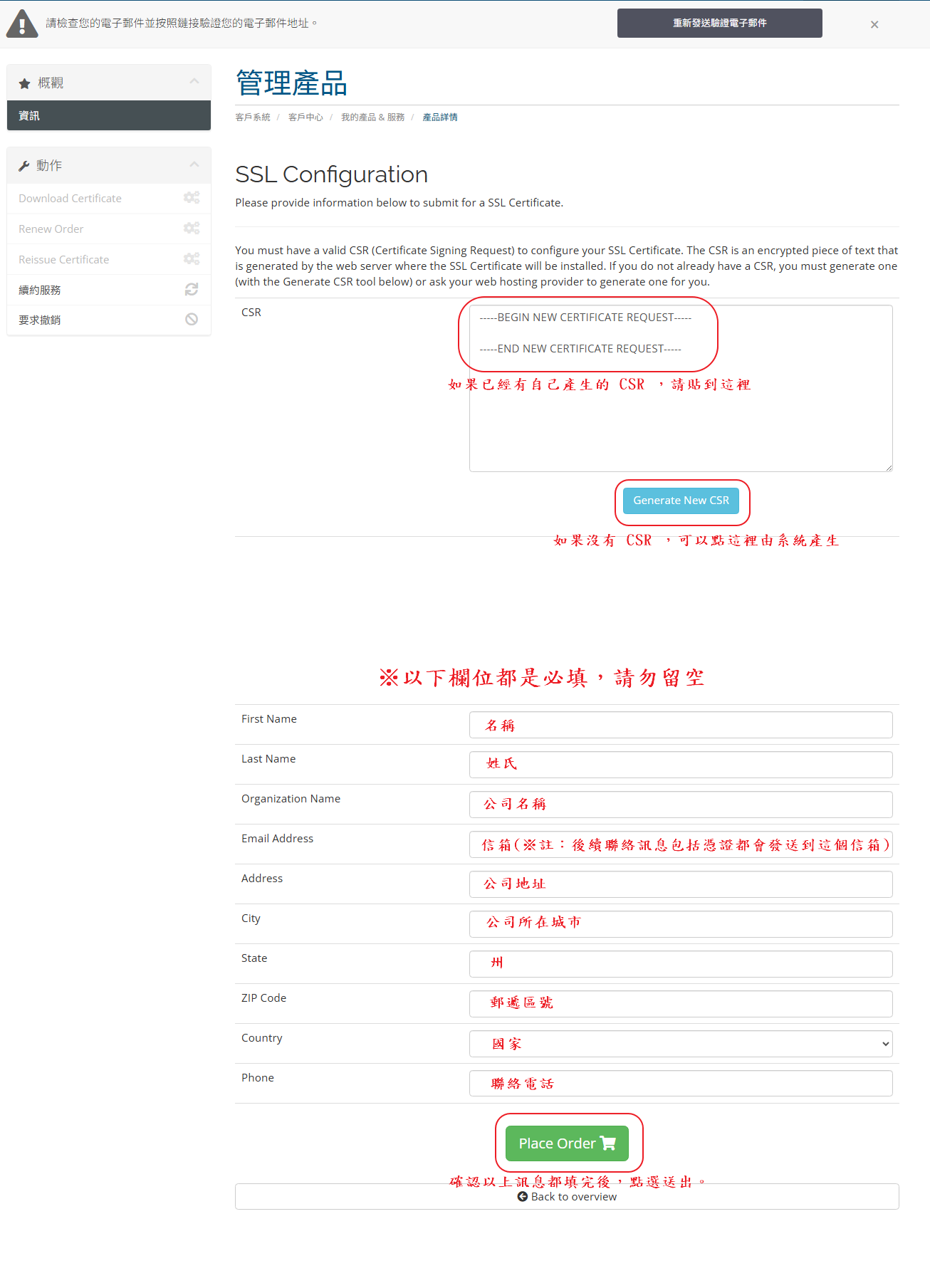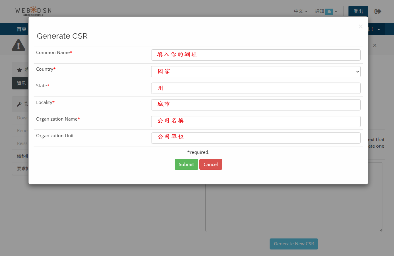 STEP.7-2 使用系統產生 CSR,所有資訊請務必填寫正確。